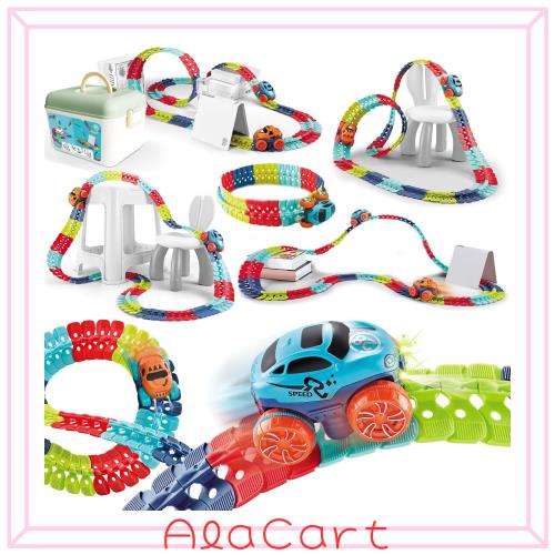 【自由な形を作れて面白い】 この商品の魅力的な点は、車がレールの上を自由自在に走り回ることができる点です。レールの組み合わせで、簡単に、車が転がる立体のコースを作ることができます、簡単です。レールは様々な形に変形させることができるため、子供たちは毎回異なるコースを作り出しては、楽しそうに車を走らせています。特に、360度ループやそびえ立つトラックなどの大胆なデザインも可能で、想像力を大いに刺激します。遊び方が無限大。単純な仕組みだが、それだけ組み合わせの自由度が高く、子供も大人も飽きない普遍的な楽しさがある。