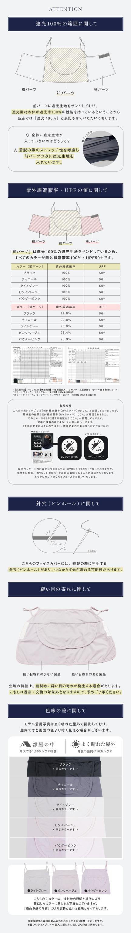 | UPF50+(※全カラー) 紫外線遮蔽率: ・ブラック・チャコール:99.8% ・パウダーピンク:98.9% ・ピンクベージュ:98.4% ・ライトグレー:98.0% | |||