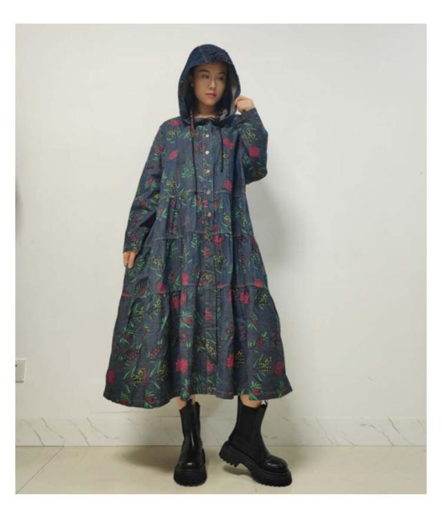 デニム ワンピース 花柄 レディース シャツワンピース 花ワンピース ロングワンピース ティアード フード付き 長袖 ロング フレア Aライン 羽織り 綿 コットン 春 秋