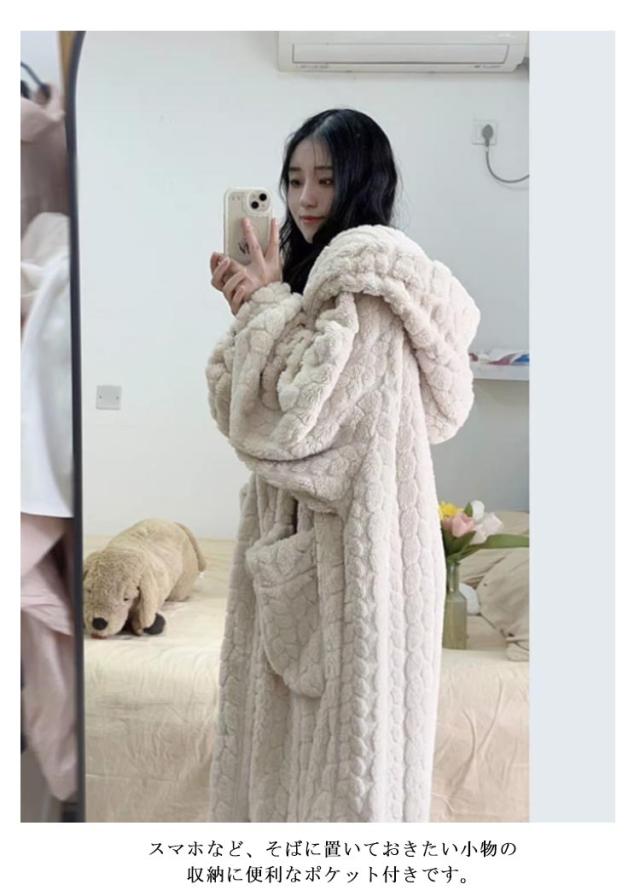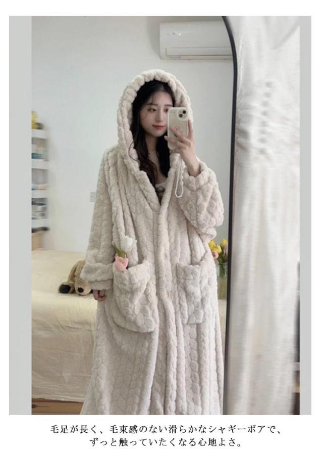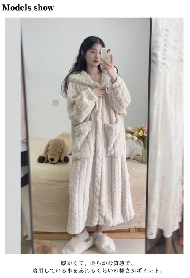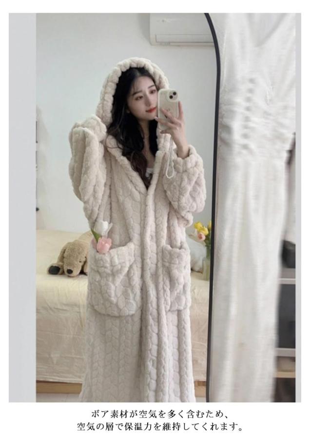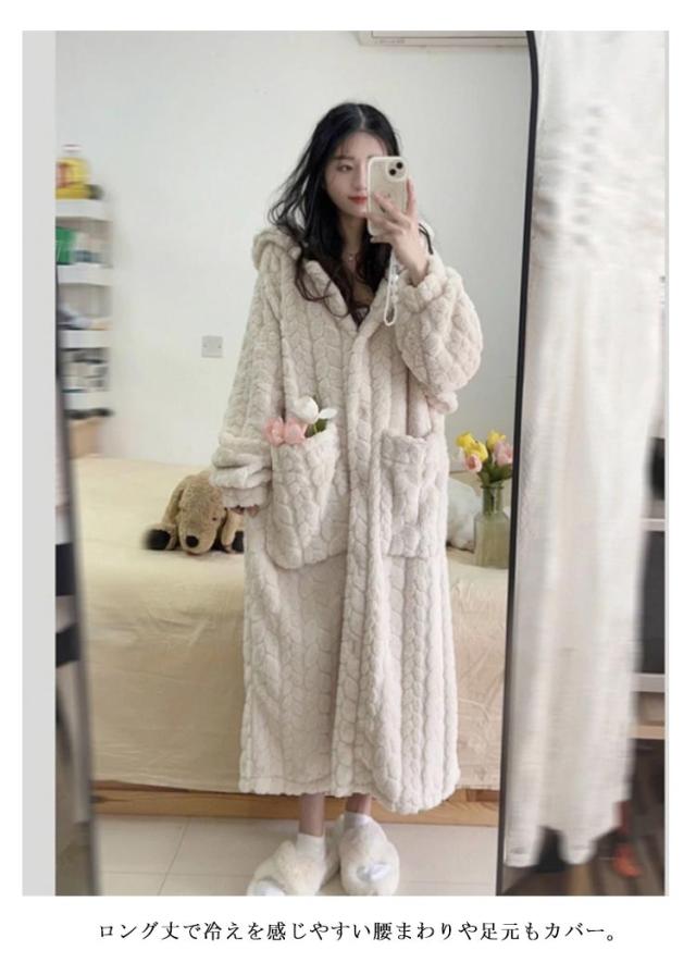 もこもこ ルームウェア 羽織り 冬 部屋着 レディース 着る毛布 厚手 パジャマ バスローブ ボアフリース ワンピース 長袖 ルームウェア ボタン 前開き フード付き ガウン 暖かい ホームウェア 防寒 保温 テレワーク 寒さ対策 可愛い