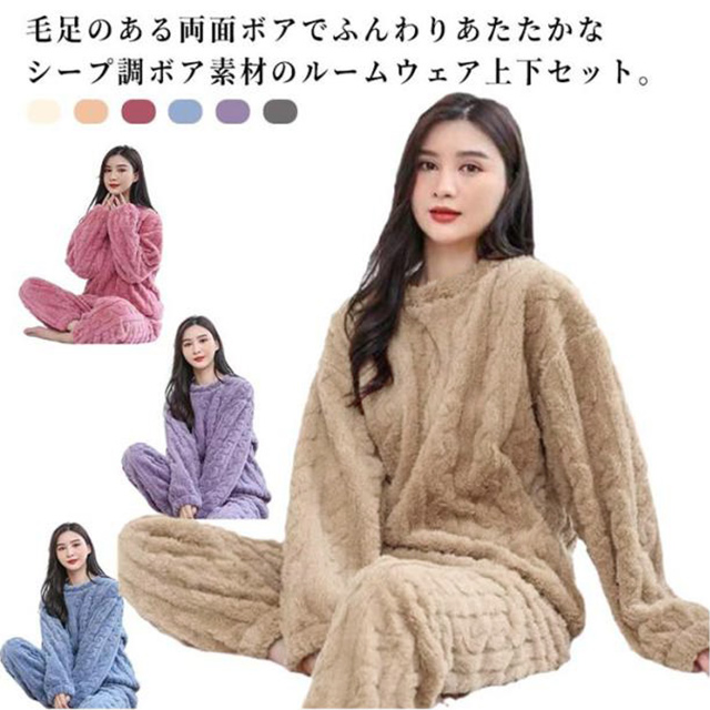 | 毛足のある両面ボアでふんわりあたたかなシープ調ボア素材のルームウェア上下セット。 ぬいぐるみのような見た目がかわいいシープ調ボア素材。 表面・裏面とも毛足があり、ふわふわ、もこもこ、ぬくぬくな素材です。 なクルーネックの長袖トップスとロング丈ボトムのセット。 かぶりでサッと着用できるタイプです。 年代問わず着用しやすい、なデザイン! | |