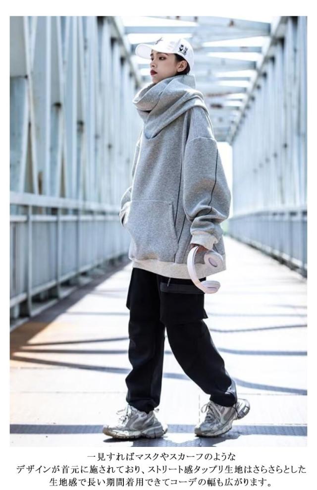 | 大きなフードと二重のハイネックで顔を隠せるので、街中でも誰にも気づかれません このフード付きスパーカーを着て街を歩けば、とても安心感があります! 首元のデザインが今までに無い、斬新なデザインのフード付きパーカーが登場しました。 一見すればマスクやスカーフのようなデザインが首元に施されており、ストリート感タップリ生地はさらさらとした生地感で長い期間着用できてコーデの幅も広がります。 これ1枚でもインナーとしてもしっかり存在感を表現してくれますよ。 男性が着ると大人格好いい印象を与えてくれますが、女性が着る場合は体型カバーができて、男女兼用の一着となっています。 | |