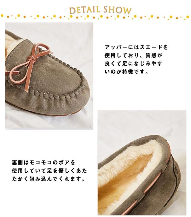 | ボリュームのあるシルエットが可愛らしいスエードシューズは、クッション性のあるふわふわのフェイクファーで足先まで暖かく包み込んでくれる優れもの。 アッパーにはスエードを使用しており、質感が良くて足になじみやすいのが特徴です。 裏側はモコモコのボアを使用していて足を優しくあたたかく包み込んでくれます。 スリッポンタイプなので着脱も簡単に行え、ちょっとしたお出かけにも使えます。 フラットで安定感もあり普段使いに最適はモカシンです。 多少の雨や水濡れに対応する撥水加工で水を弾き水濡れによる変色等の影響も少ないです | |