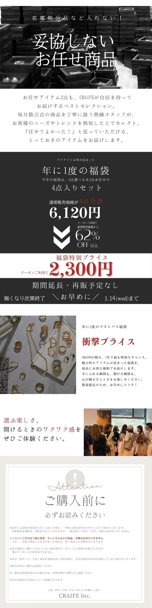 | 商品説明 | CRAIFEが贈る年に一度の特別なサプライズ 通常6,120円以上のアクセサリーが、 福袋限定プライス2,300円(クーポンご利用時)で手に入る! またとないチャンスです。 自分へのご褒美や大切な方へのギフトにもぴったりな、心が躍る瞬間をお届けします。 数量限定ですので、お早めにどうぞ。 |