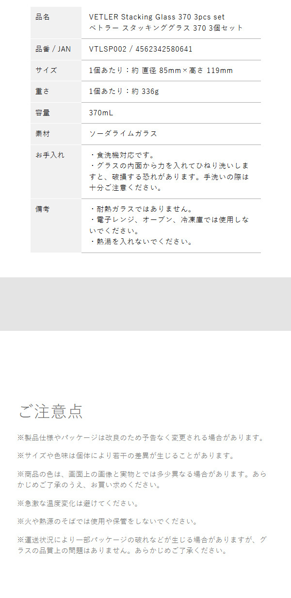 ■ VETLER スタッキンググラス370 3個セット