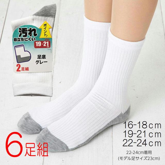 6足組 スクールソックス 【2足組×3】 汚れが目立ちにくい クルーソックス リブ 白地 足底グレー 16-18cm 19-21cm 22-24cm 靴下 スクールソックス 汚れ ソックス 汚れ目立ちにくい 洗濯らくらく