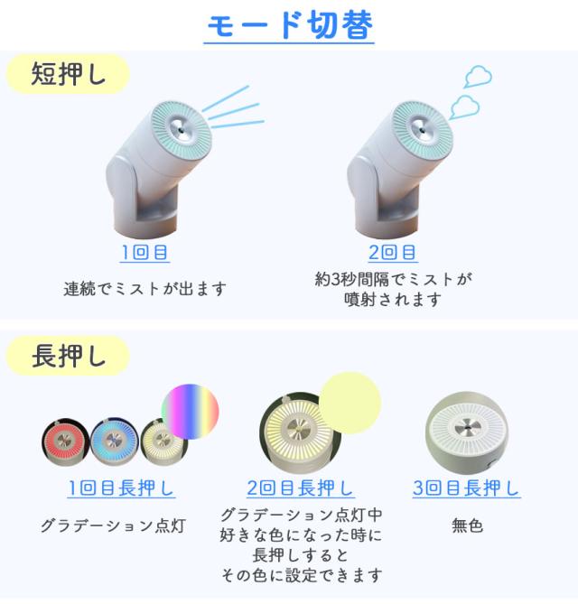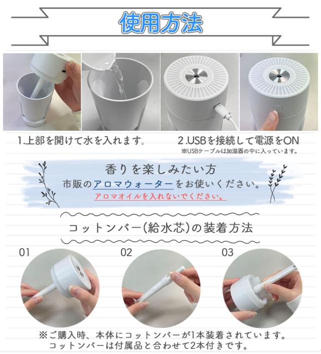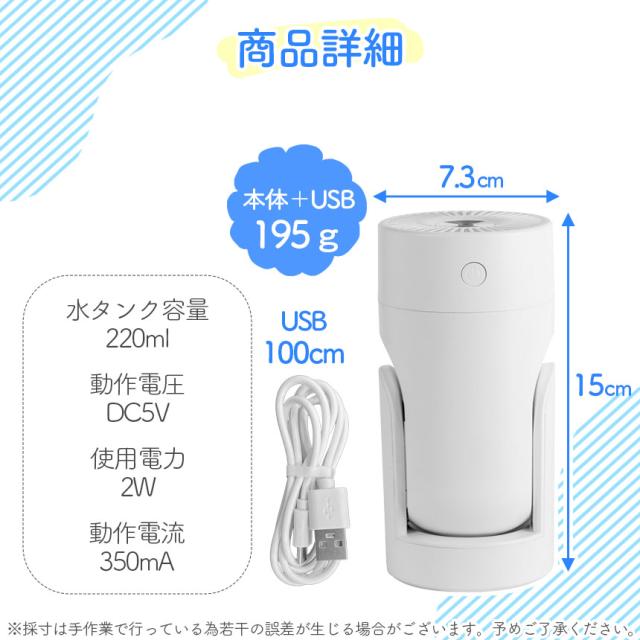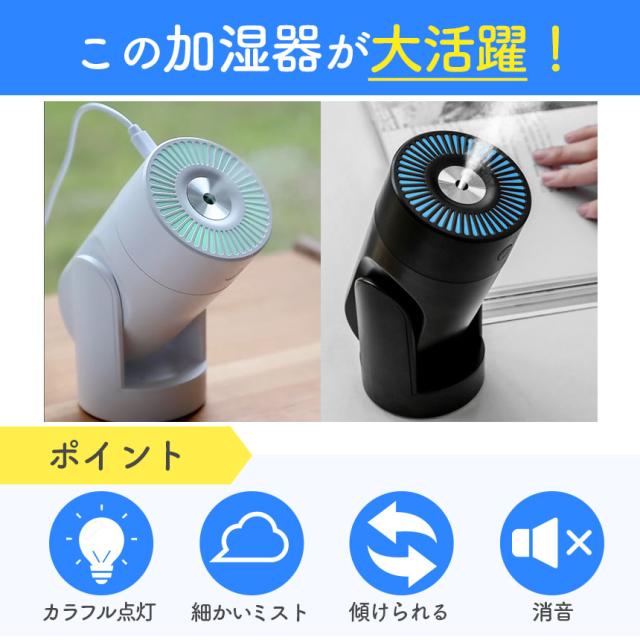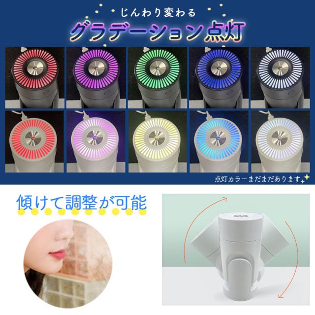 ●LEDライト付き加湿器!●カラフルに光る!コンパクトなミニ加湿器でオフィスなどの机の上や車の中にも置けます。日々の疲れも乾燥もこの1台で【カラフルなライト】グラデーションで変わるモードに加えて、自分の好きな色に設定できるモード、光らせず加湿だけを楽しむモードとシーンに合わせて変更が可能です。【アロマウォーター】上部を外し水を張ったタンクに市販のアロマウォーターを加えると、加湿に加えて香りまで楽しめます。※オイル類は使用しないでください。【可動域】加湿器の角度を変えることができます。直接顔の方に向けることができます。※垂直にはなりません。