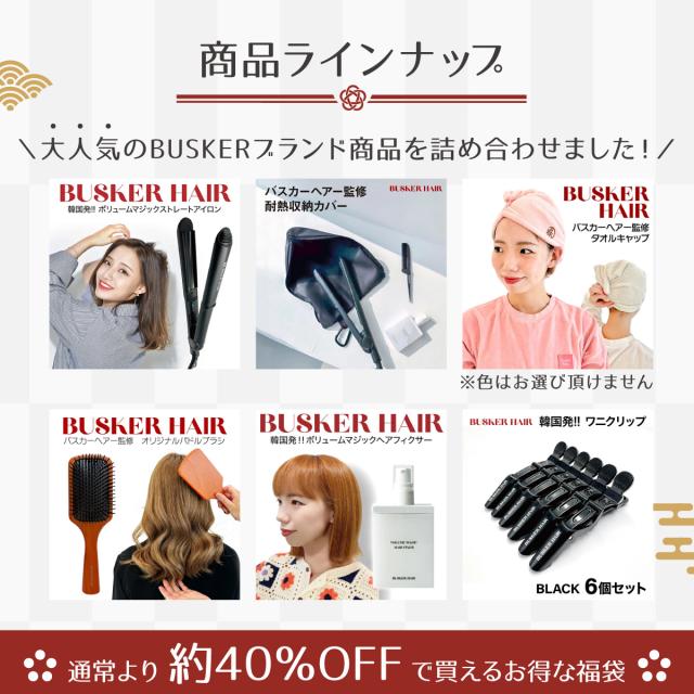福袋 BUSKER HAIR バスカーヘアセットストレートアイロン ヘアアイロンケース タオルキャップ パドルブラシ ボリュームマジックヘアフィクサー ワニクリップ fuku-busker25