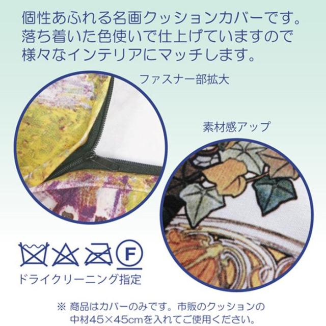 | 綿製の素材を使い、高級感のあるマットな風合いです。アートを両面にプリント!落ち着いた色使いで仕上げていますので様々なインテリアにマッチします。 ※商品はカバーのみです。市販のクッションの中材45×45cmを入れてご使用ください。 |