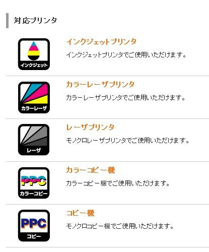 | レーザプリンタ(カラー・モノクロ)、インクジェットプリンタ、コピー機(カラー・モノクロ)できれいに印刷できます。段ボールの再利用やリサイクル時の分別も簡単です。 ※モニターの設定などにより実際の色味と異なって見える場合があります。予めご了承ください。 |