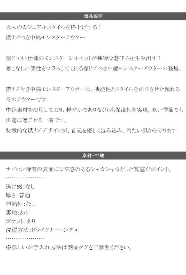 クラシカルエルフ冬新作 アウター ジャケット レディース 襟 リブ 裾 ドロスト 付き 中綿 モンスターアウター 男女兼用 ユニセックス メンズ ゆるっと オーバーサイズ 大きいサイズ 2024aw ce1010381