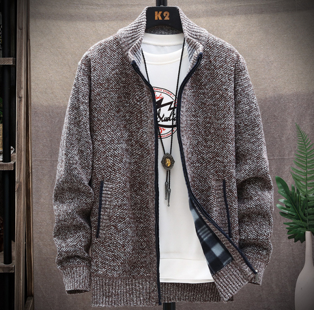 カーディガン ニットジャケット メンズ トップス 長袖 裹起毛 ニット 切り替え 厚手 防寒 あったか ジップアップ カジュアル 秋冬 コーヒー