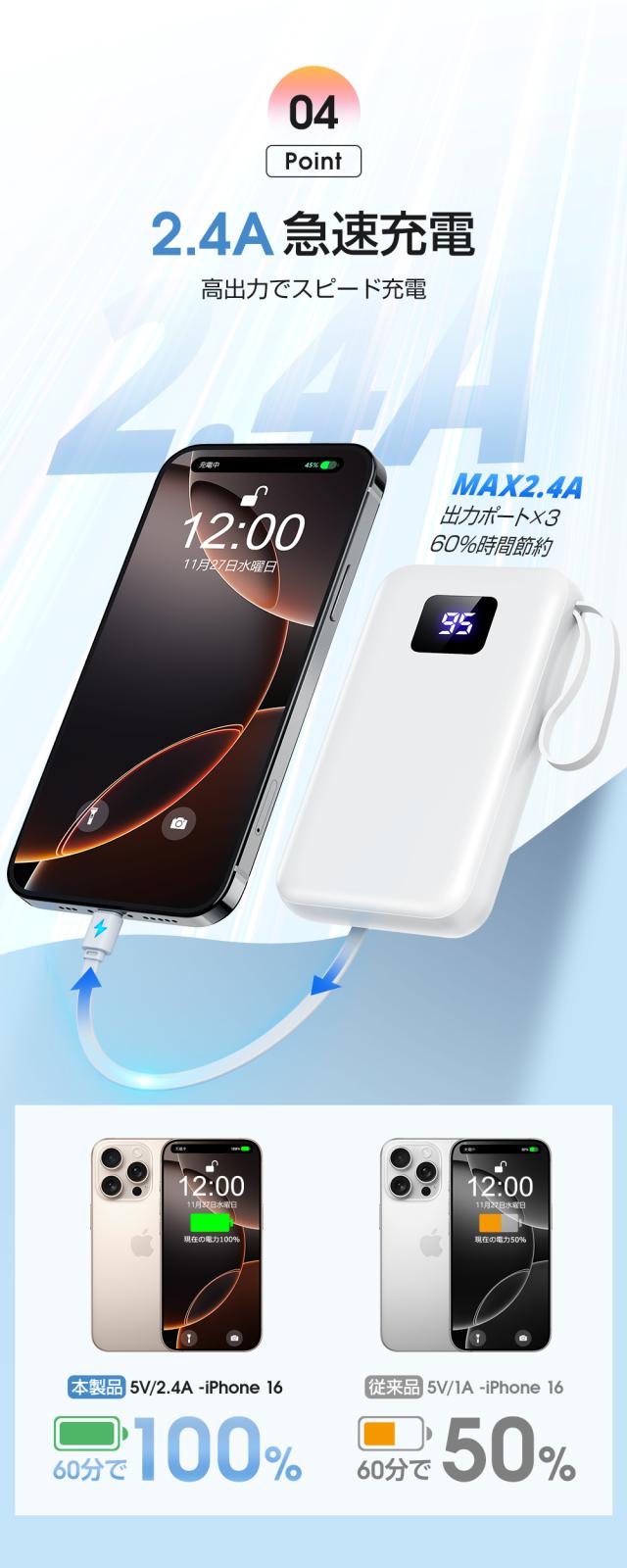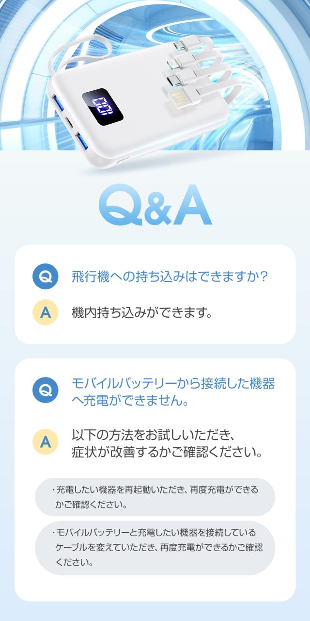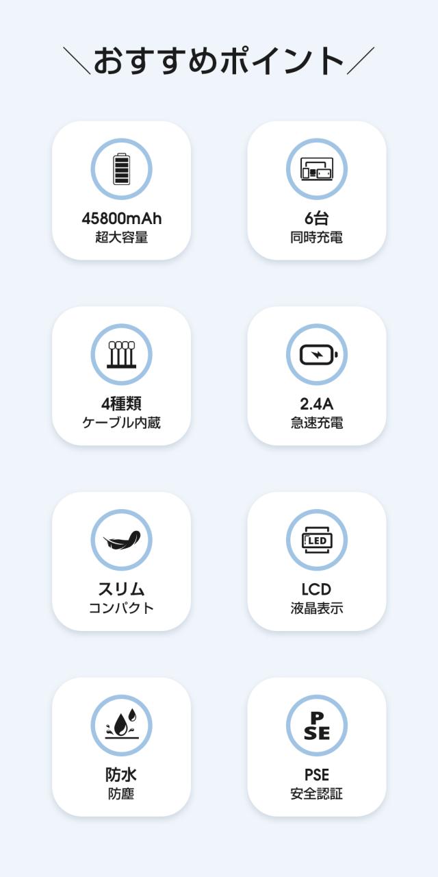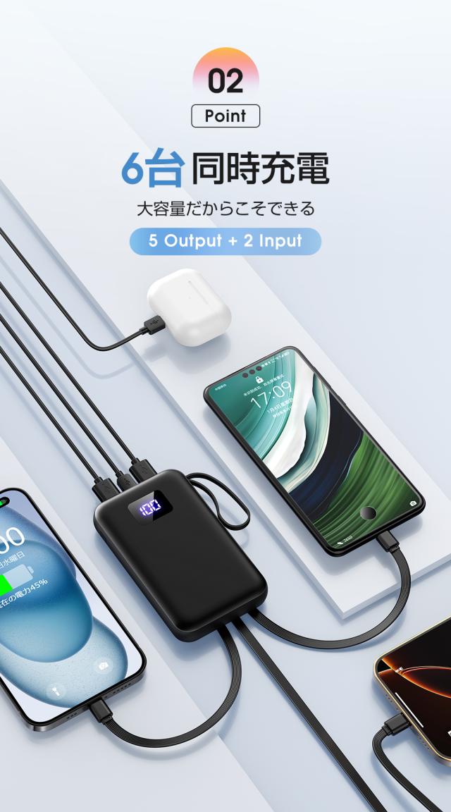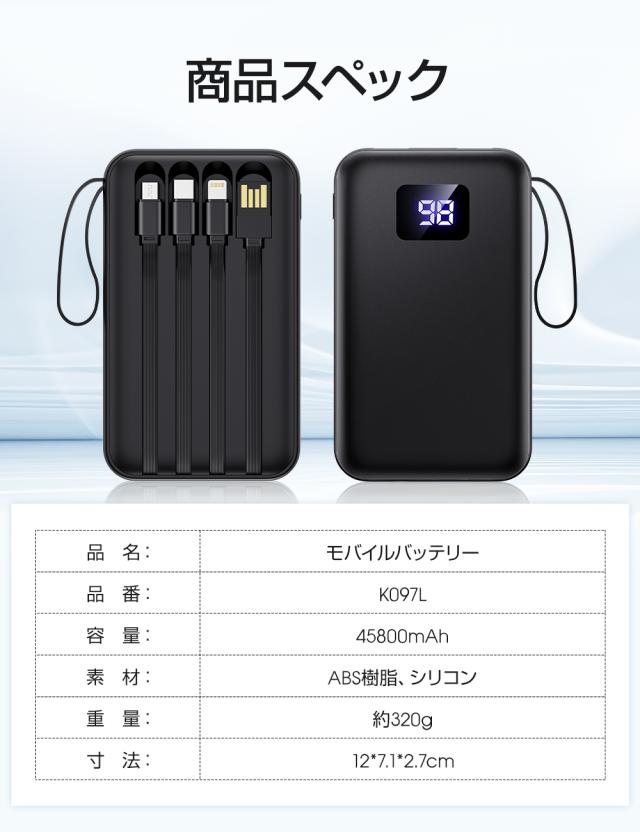 | 仕様 | 【45800mAh 大容量 ケーブル内蔵型 モバイルバッテリー】 45800mAh 超大容量 を備え、スマホ、タブレットだけでなく、その他ほとんどのUSB機器にも複数回充電できるモバイルバッテリーです。 4つのケーブルを内蔵することで持ち運ぶケーブルを減らすことができ、持ち物をさらにシンプルにし、いつでもどこでも充電を可能にします。 軽量ながら45800mAhの大容量を実現、パワフルかつポータブルで通勤通学の外出時や出張の際にはもちろん、停電の際や災害時に活用できる防災用途のバックアップ電源として幅広いシーンでご利用いただけます。 【6台同時充電&急速充電可能なポート】 3種類の内蔵出力ケーブル(Type-C&ライトニング&micro USB)+二つの出力ポート搭載(USB-A1&USB-A2)、入出力兼用Type-Cポートに加え、最大6台のデバイスの同時充電が可能、コンセントのない場所でも手軽に充電できるため、安心して出かけることが可能。 畜電可能な充電ケーブル(USB-A入力)を内蔵することで、別途充電ケーブルを持ち運ぶ必要がなく持ち物を少なくし簡単に充電することが可能で、完全なケーブルレスを実現。ケーブルを忘れたときも充電ができないなんて心配はありません。 最大5V/2.4Aで急速充電可能USB-A出力ポートを搭載することで、通常の5W出力に比べ2倍以上の速度で充電することができます。 【LCD電池残量表示&コンパクト】 高品質LCD液晶ディスプレイを搭載しており、残量を1%刻みで表示できるので、電池残量が一目で確認できます。使うときにバッテリーの残量が無いといった不安を解消します。また、給電または蓄電状態をマークで確認でき、使用状態を把握しやすいように「見える化」に設計されました。 市販の バッテリー は、45800mAh モバイルバッテリー は500gから1kgの重さがあります。こんな容量なのにわずか約320gという軽さ、手ひらのサイズで外出先でも手軽にスマートフォンやタブレットなどを充電できます。 コンパクトボディは片手持ちが苦にならず、持ち運び超便利! 【Smart IC搭載&安心保護機能】 この45800mAh 大容量 モバイルバッテリー には、Smart ICという技術が搭載されています。デバイスに過度な電流が流れることを防ぎ、効率的な充電が可能になります。スマートウォッチやワイヤレスイヤホンなど、低電流で充電する必要がある小型デバイスにも対応できます。出力過圧保護/出力過電流保護/出力短絡保護/入力過圧保護/入力過電流保護/電池過充電保護/電池過圧保護/電池過放電保護など多重の安全保護措置を備え、安全と性能を一体化したモバイルバッテリーです。 【PSE安全認証済】 電気用品安全法(PSE)の技術基準に適合して、安心して持ち歩くことが可能です。高品質な素材・最先端の電子基板・保護機能が採用されており、安心・安全なプレミアム設計になっています。 |