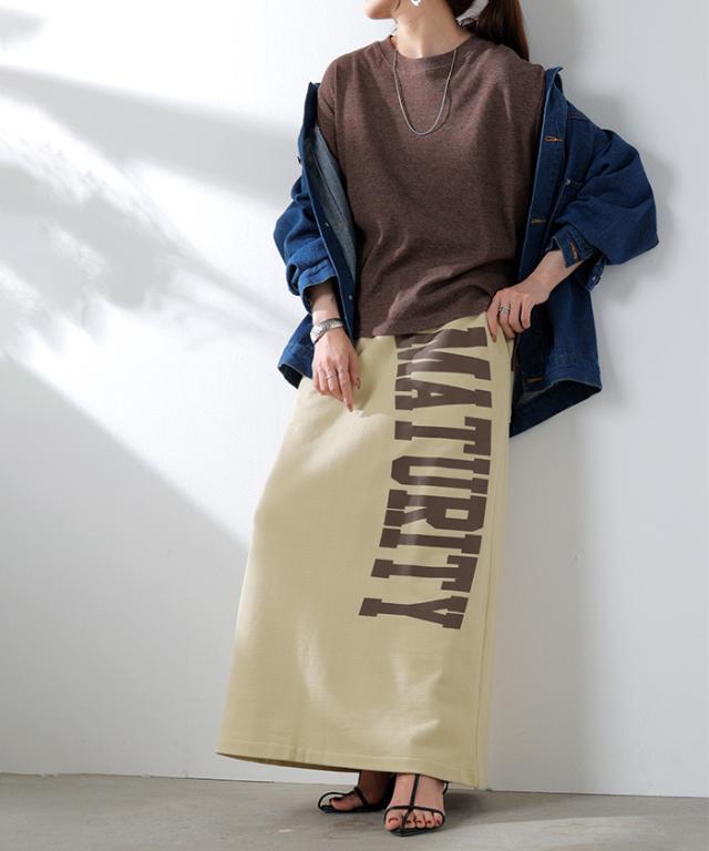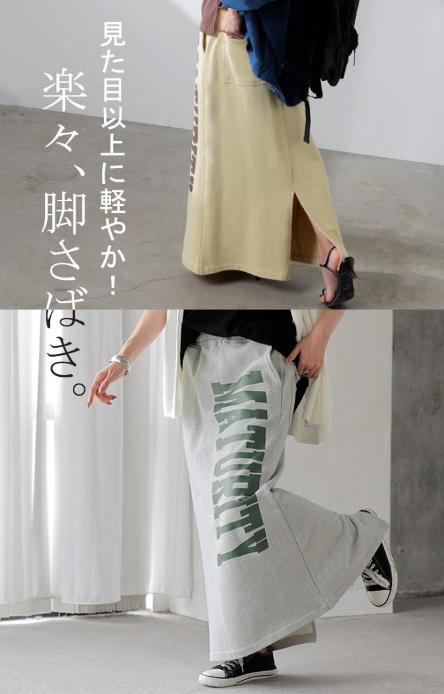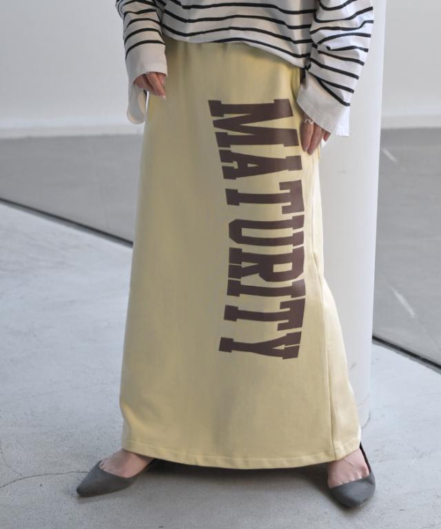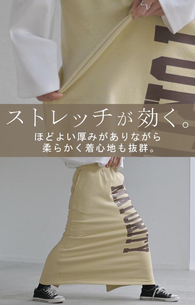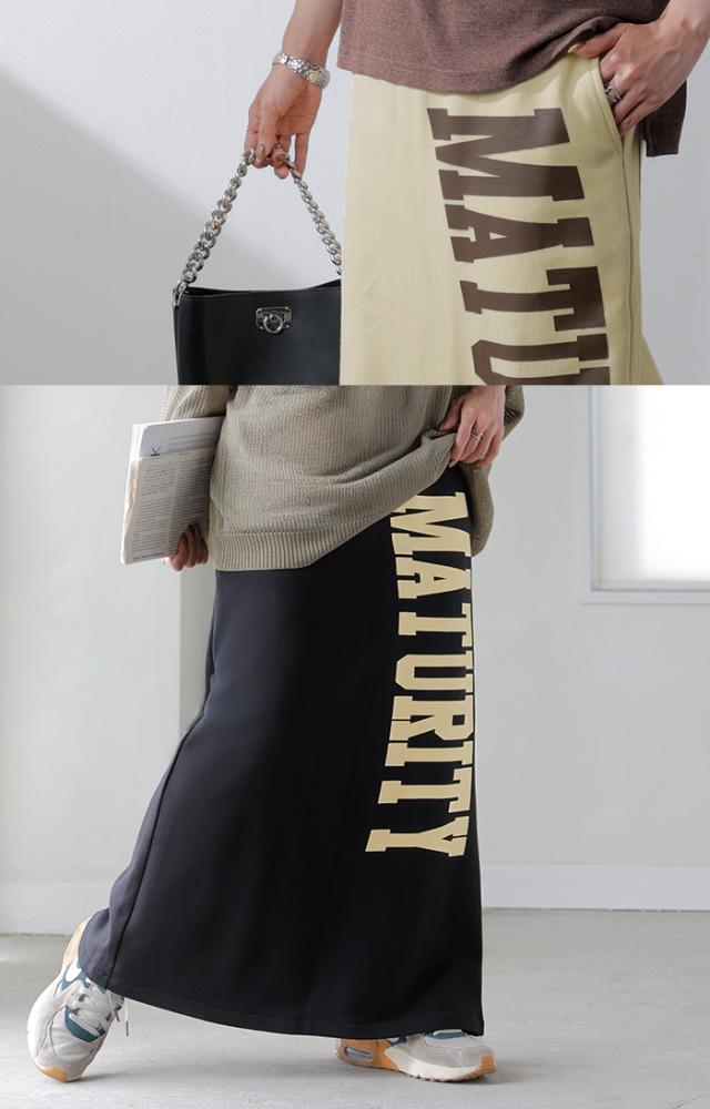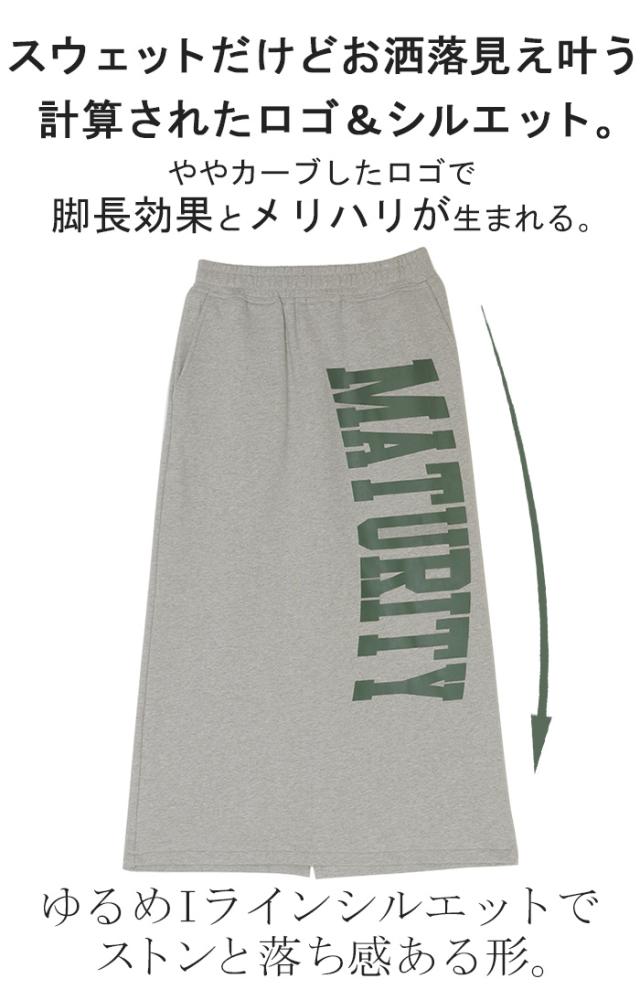 大きくプリントされた英字ロゴが目を惹く裏毛ナロースカートです。