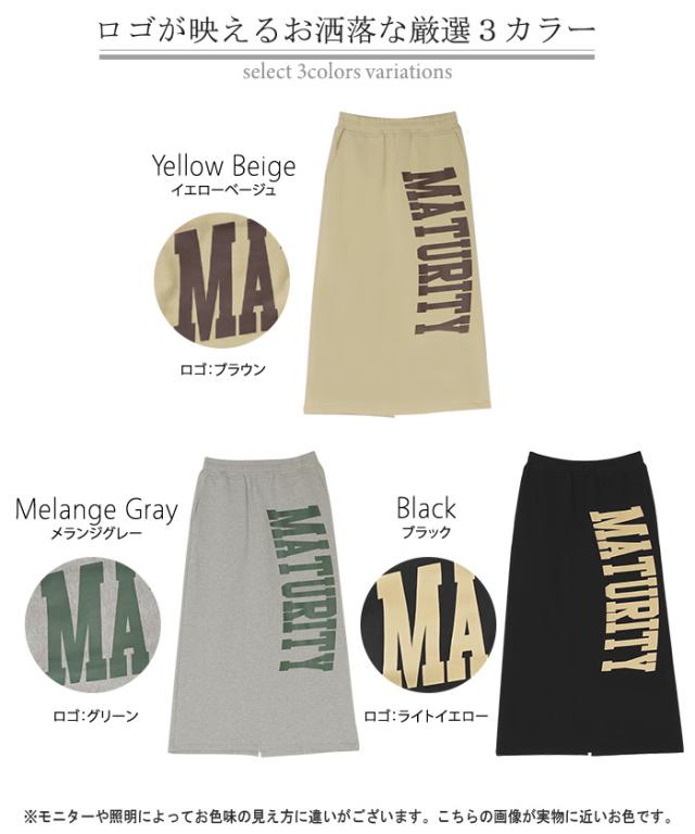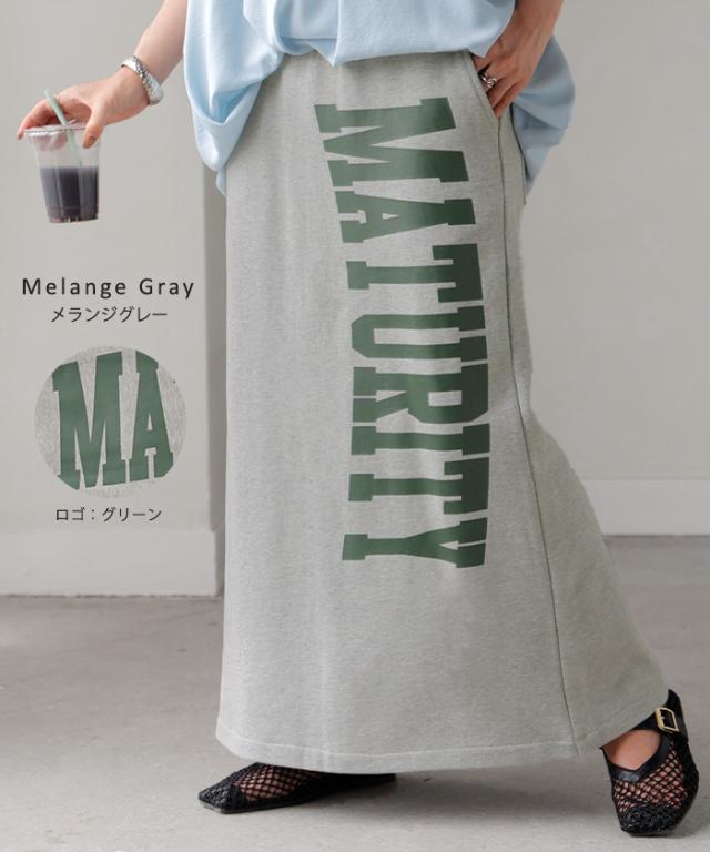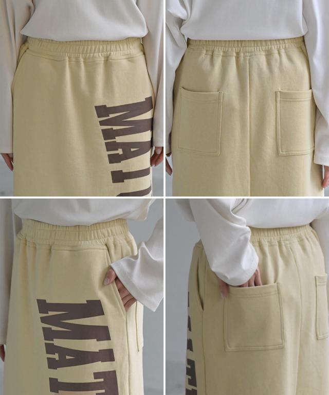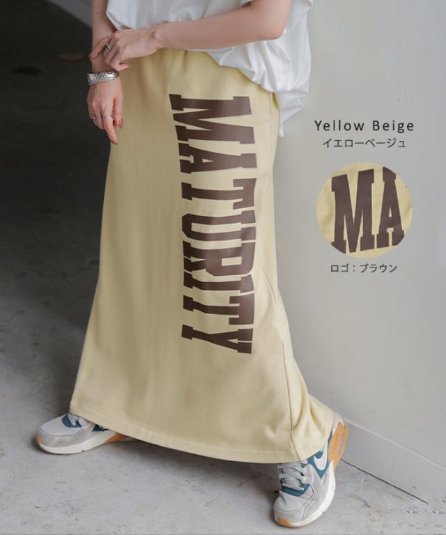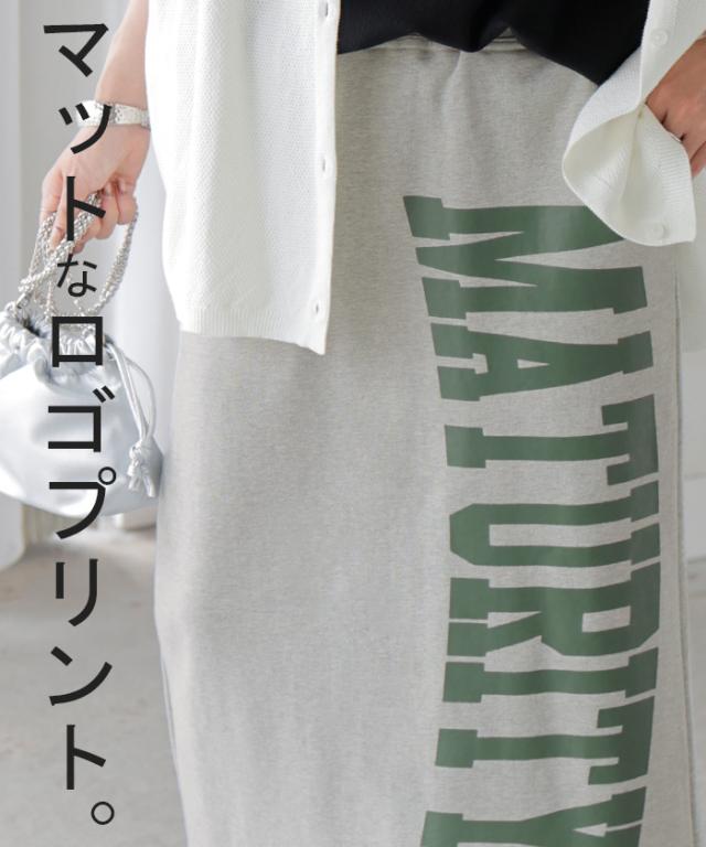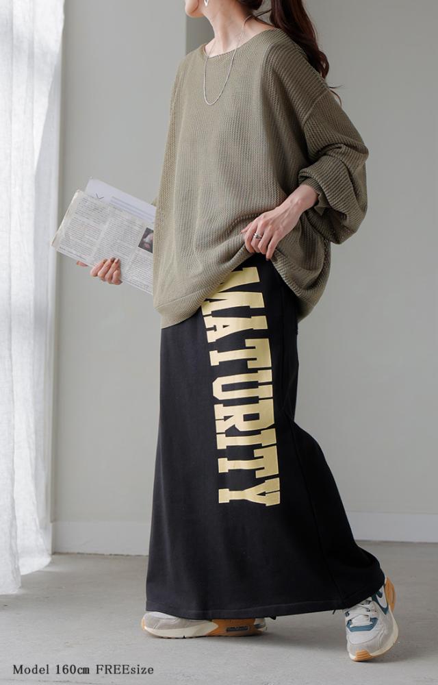 大きくプリントされた英字ロゴが目を惹く裏毛ナロースカートです。