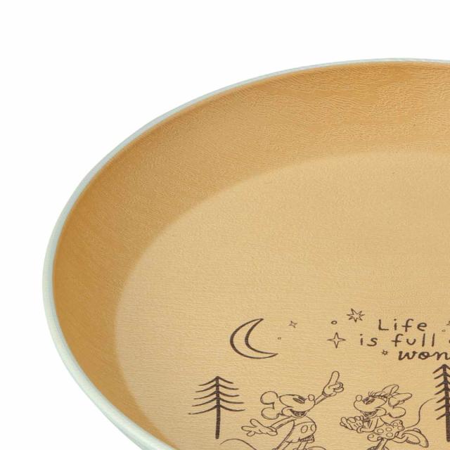 キャンプの夜、ミッキーとミニーが夜空を見て愉しくお話しているような風景がデッサン風に描かれています。主張することがないので盛り付けの邪魔はしません。外側の淡い色合いと内側が木目調カラーが優しく調和されていて毎日使いに飽きがこないです。