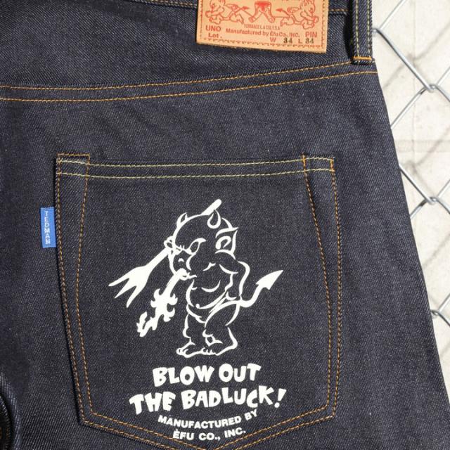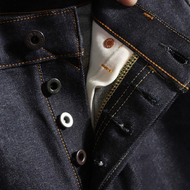 カイハラ社製13ozセルビッチデニムを使用した定番のストレートシルエット(DEVIL-5号と同スタイル)です。
