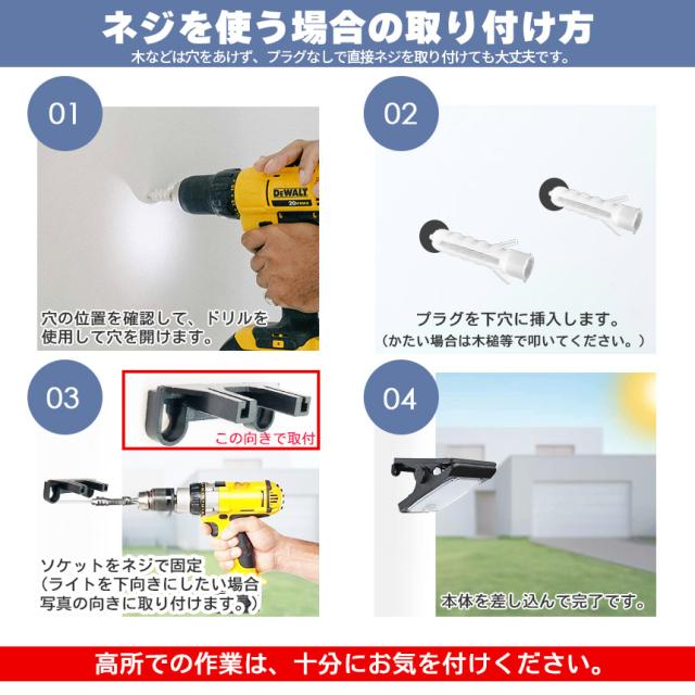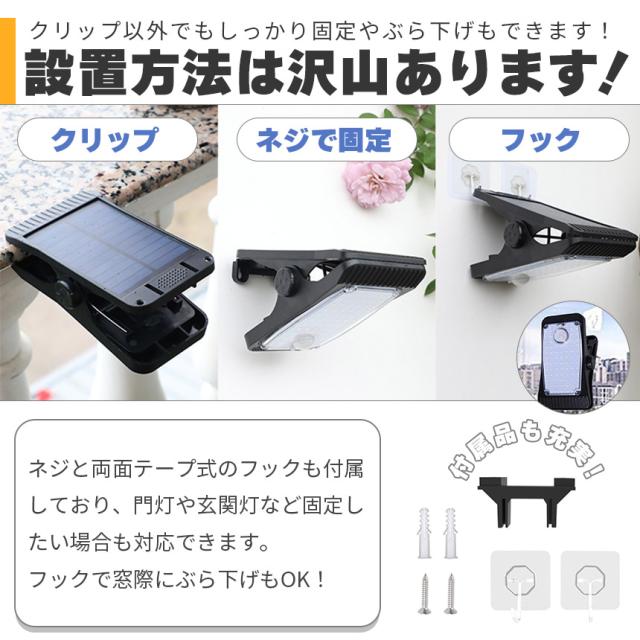 ソーラー内蔵センサーにより、日中自動的に消灯、夜間に自動点灯、手でコントロールする必要はありません。クリップではさめるので、さっと取り付け出来ます。また、付属のラケットや固定ネジ、フックなどで様々な取り付けもできます。据え置きで固定させたい方も対応できます。