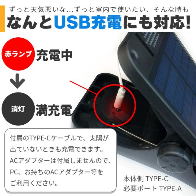 日が当たらないところで使いたい、夜も充電したい、そんな時もUSB充電対応!いつでも充電出来てとっても便利!