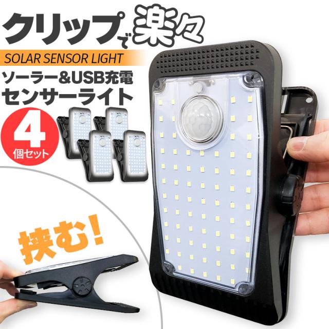 クリップソーラーライト 4個セット センサーライト ガーデンライト USB充電 ソーラー充電 昼白色 電球色 防犯灯 3000mAh蓄電池 アウトドア キャンプ ソーラー ソーラーライト 暗闇センサー 動体センサー人感 照明 IP44防水 防犯 人 庭 ガーデン 階段 室内 室外