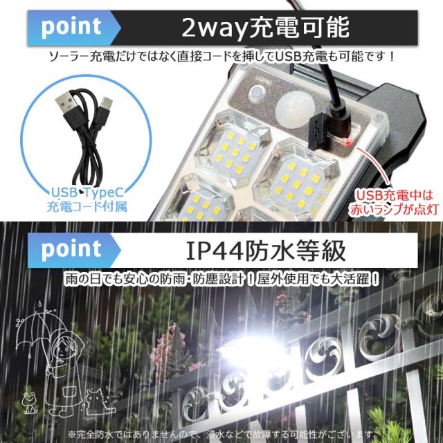 こんなお悩みはありませんか?・夜、家の周辺が暗い…・家の防犯対策が心配…・電気代を節約したい…・雨の日でも使いたい…そんな時にこのソーラーライトがおすすめです!【ソーラー&USB充電】光センサーが搭載されているので明るい場所でソーラー充電し、暗い場所で自動で点灯します。また、付属のコードでUSB充電も可能です。