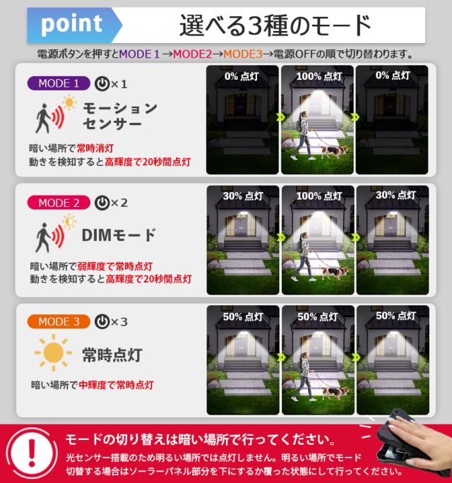 ※※明るい場所でモードの切り替えを行う場合はソーラーパネル部分を下にするか、覆った状態で行ってください※※