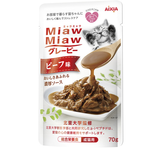 お魚とお肉のおいしさが詰まった素材を濃厚なグレービーソースでからめた総合栄養食。お部屋で暮らす愛猫の心の健康維持に配慮して「a-iペプチド」を配合。