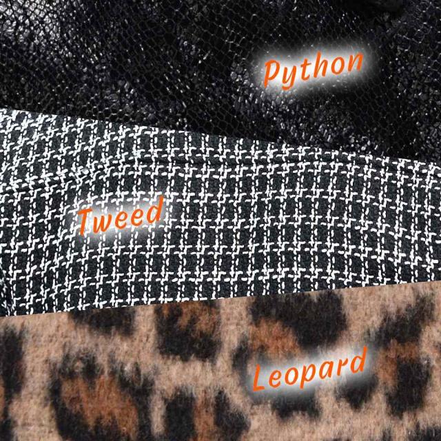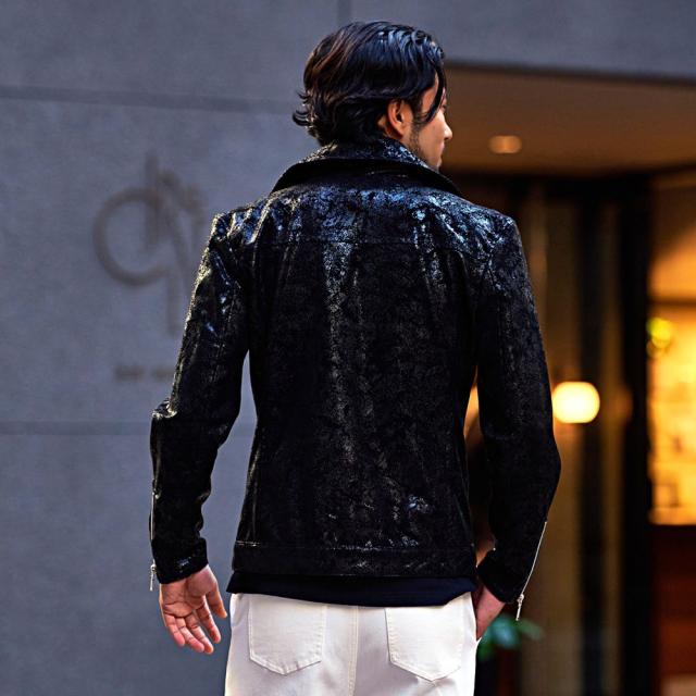 パイソン柄を思わせるような生地にクラック加工、さらにコーティングの光沢感をプラスし退廃的な美しさを演出したブラック。
