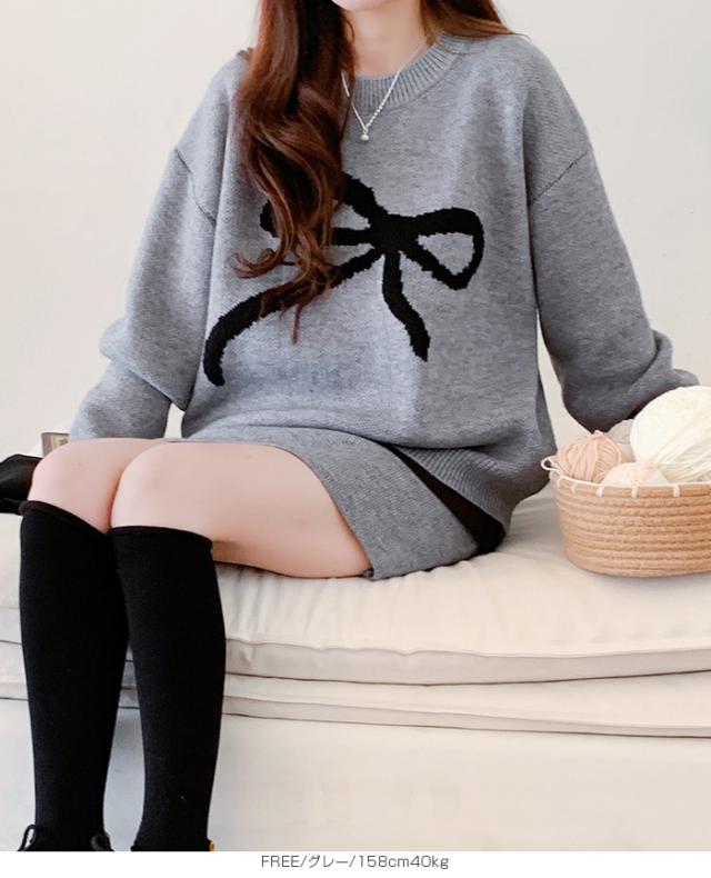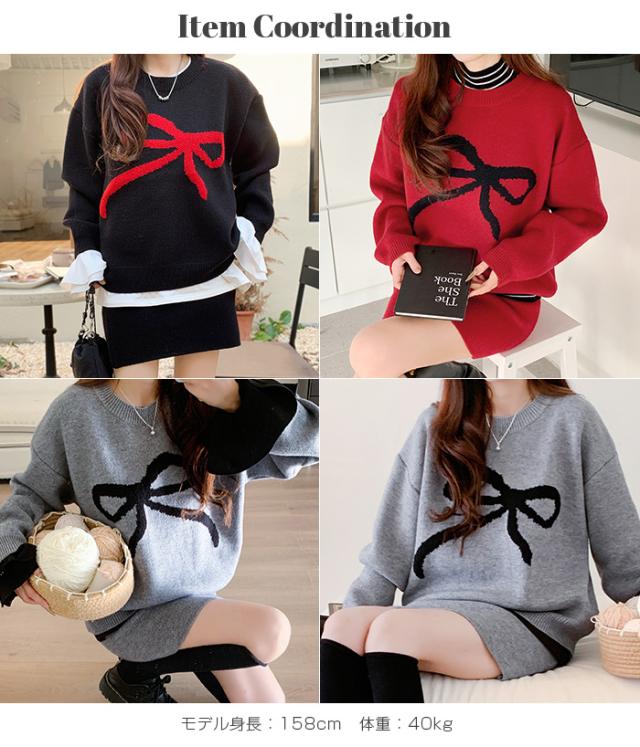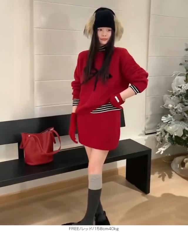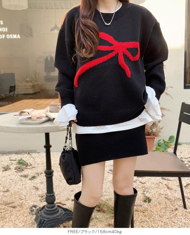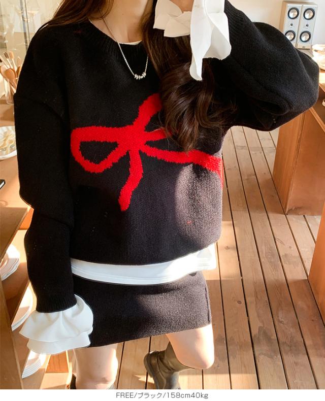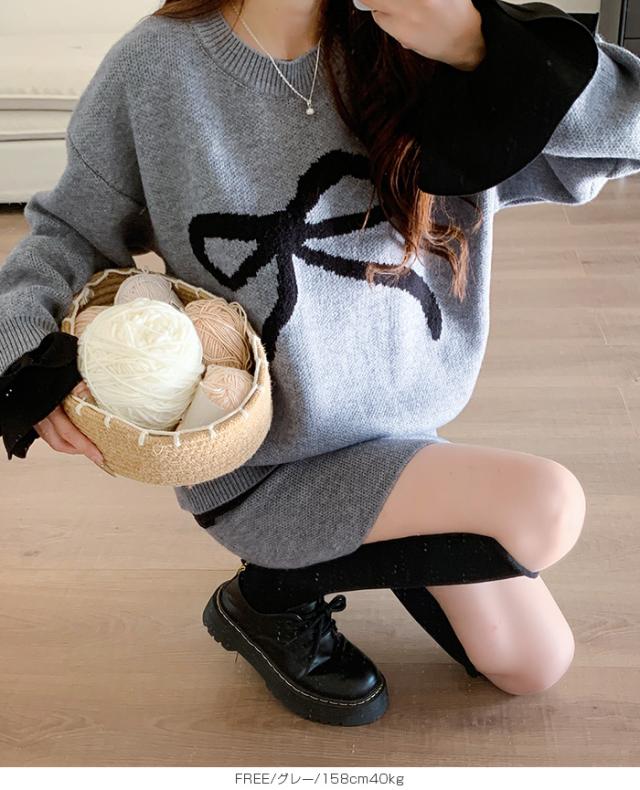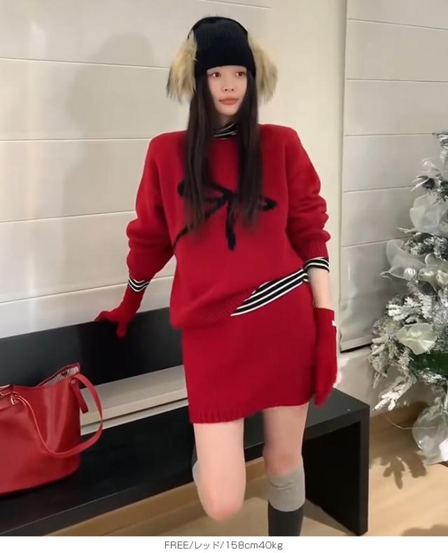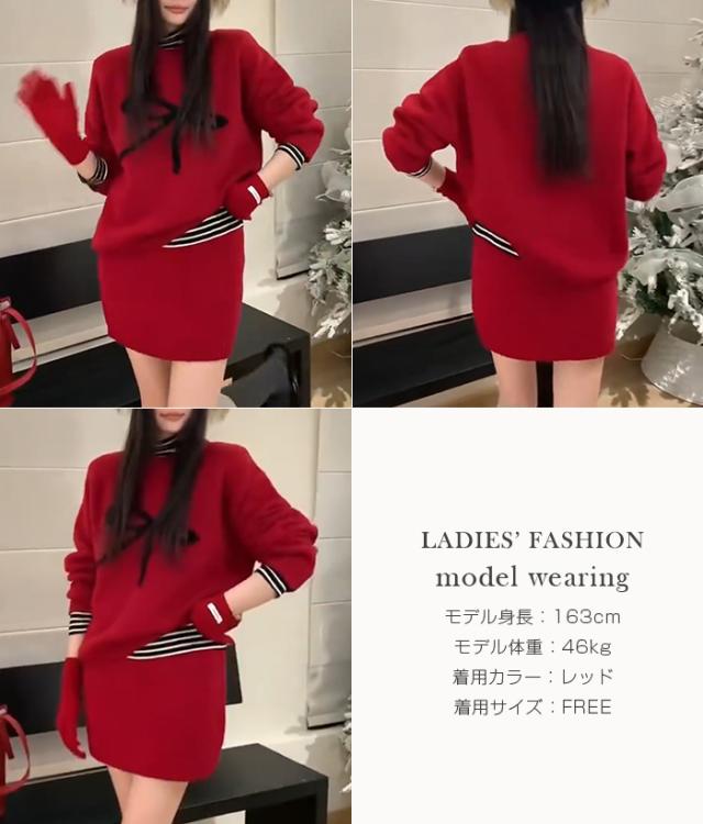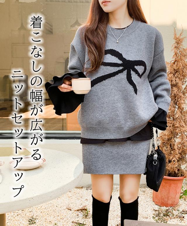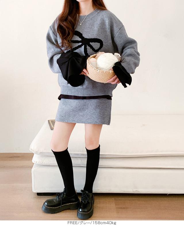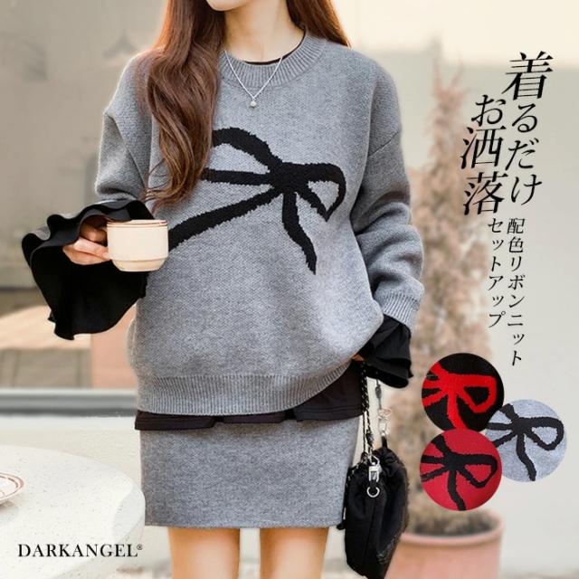 1,500円OFFクーポン!セットアップ ニット スカート ミニスカート レディース 上下セット 2点セット セーター 体型カバー カジュアル リボン 着るだけ秒でオシャレ【配色リボンニットセットアップ】 ダークエンジェル 春新作 ●即納●