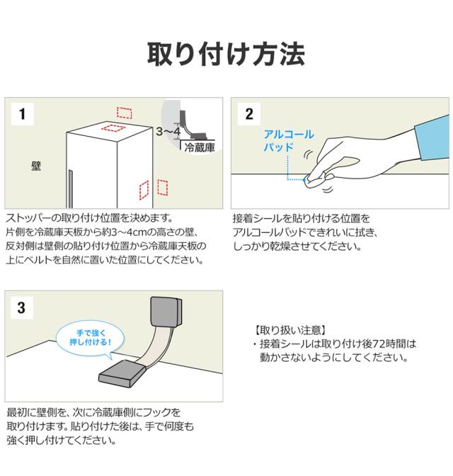ストッパーの両端に取り付けられた接着パッド付きフックの一方を冷蔵庫に、もう一方を壁面に接着固定して使用します。接着固定のため、壁面の穴あけ工事が不要です。また、取り付けの際に冷蔵庫を動かす必要がありません。