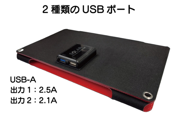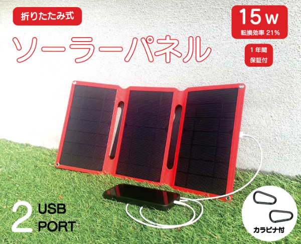 ソーラーパネル一体型のモバイルバッテリー!USB出力2ポート搭載。太陽光で携帯等バッテリー充電できるソーラーバッテリー。持ち運びしやすい折り畳み式で防災袋やバッグにラクラク収まるコンパクトサイズです。最大出力15Wでタブレットなども充電可能です。防滴仕様(※コネクタ部分は非防滴)だからキャンプやアウトドア・防災時にも最適です。