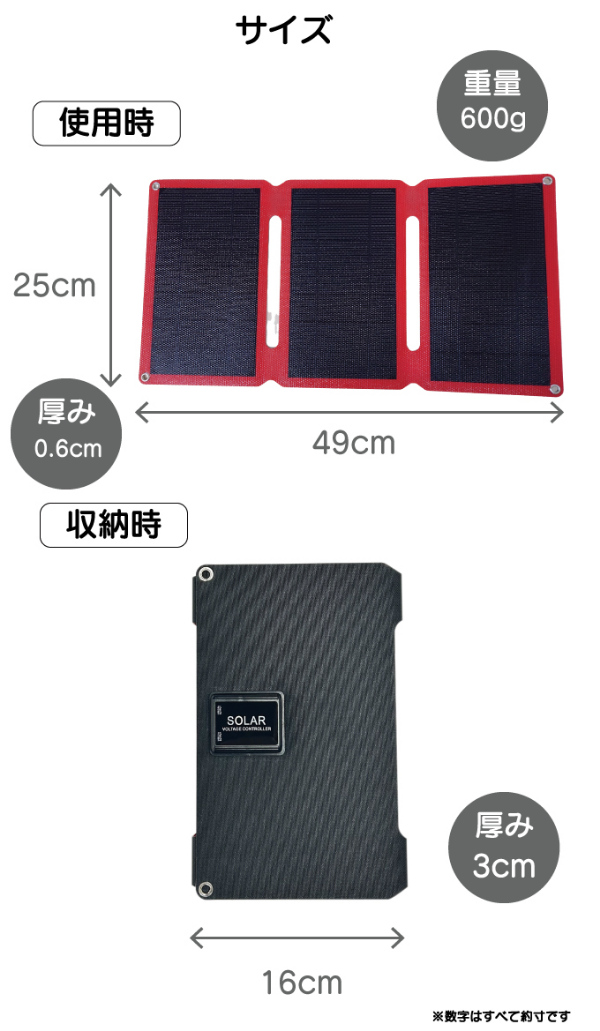 【型番】QT-380【材質】■本体:ETFE、EVA■セル種類:単結晶シリコーン【仕様】●最大出力:15W●最大動作電圧:25V●最大動作電流:3A●変換効率:21%●出力ポート:USB-A×2口●温度動作範囲:-20℃〜60℃【商品サイズ(約)】■使用時:49×25×0.6cm■収納時:16×25×3cm【商品重量(約)】600g【個装サイズ(約)】26×17×4cm【個装重量(約)】700g【生産国】中国