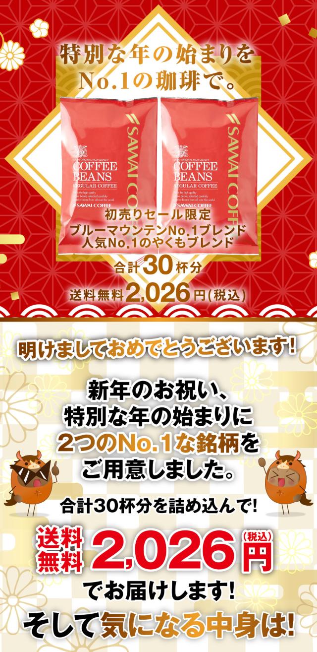 こちらは「ブルーマウンテンNo.1ブレンド」と「やくもブレンド」という人気の高い2つのコーヒーがセットになった、新年にぴったりな特別セットです。合計30杯分のコーヒーを送料無料でお届け致します。上品で香り豊かな味わいで、新しい年の始まりを贅沢に楽しめます。