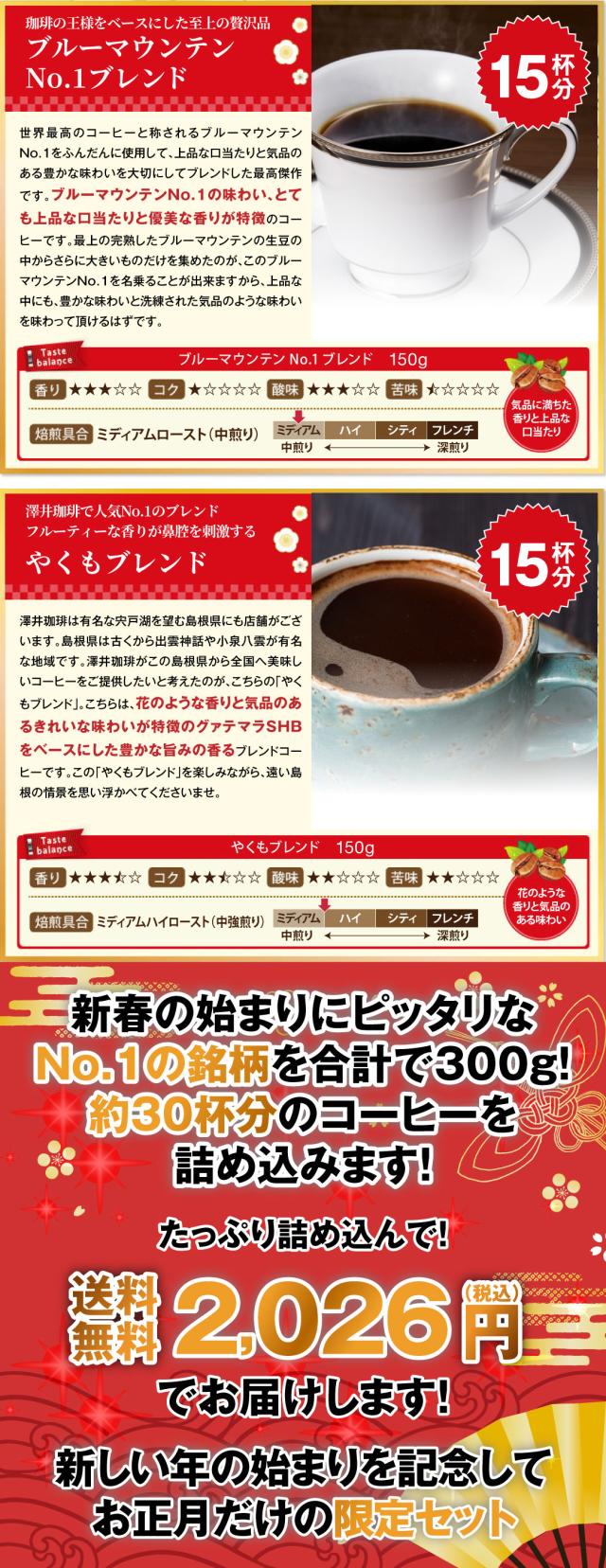 初売り 焙煎したて コーヒー豆 300g お試しセット 送料無料 メール便 150gx2袋 コーヒー専門店 30杯分 飲み比べ ブルーマウンテンNo.1ブレンド やくもブレンド 澤井珈琲
