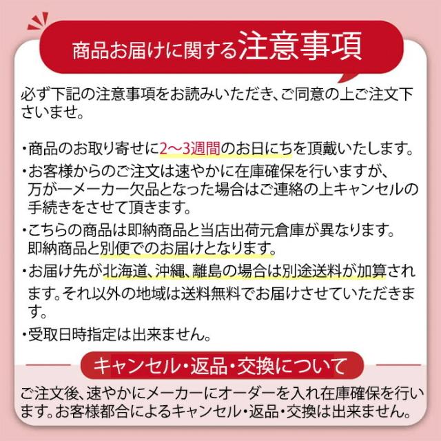 1月18日(土)〜2月4日(火)のご注文は中国の(春節)旧正月休みに伴い、当店提携工場もお休みとなりますため上記お届け目安よりプラス10日程度商品のお届けにお時間を頂戴致します。ご了承下さいませ。