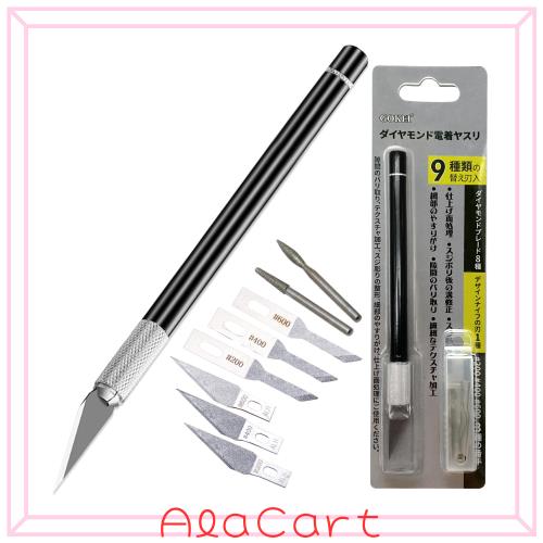 ?【ダイヤモンド電着ヤスリ&刃9枚】パッケージ内容:ヤスリ本体ホルダー*1本、刃9枚(9種類の替え刃入)、ケース(刃を入れる用)*1、キャップ*1 ダイヤモンドブレード8種(テーパ23°/テーパ45°の三角型・丸型 #200/#400/#600の番手)+デザインナイフの刃1種 ※2.35mm軸用コレットの装着サイズ(目安):2.1~2.5mm軸 本体:アルミ合金 コレット:真ちゅう 保護キャップ:ABS 番手は#200、#400、#600の3種の番手あり、用途に応じて使い分けられます。細かい所なら十分な切削力があります。デザインナイフと同じ形状のダイヤモンド電着ヤスリです。※刃の交換方法は、取扱説明書を参考ください。★★【ご使用上の注意】 十分に水気を切って乾燥させてから保管してください。水気が残っていると、サビなどの発生につながります。