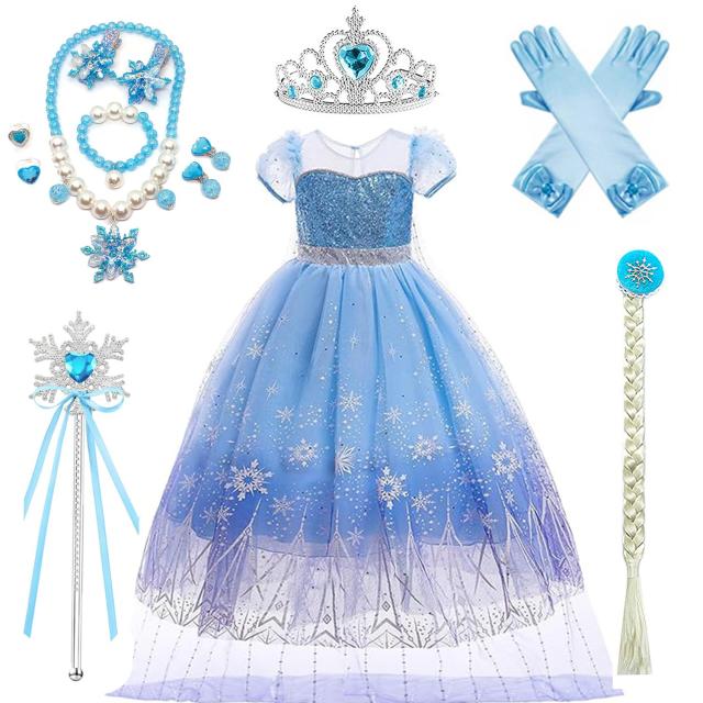 【エルサとアナ風ドレス特集】ディズニー映画『アナと雪の女王』にインスパイアされた、特別なプリンセスドレスが登場しました。美しいブルーのチュールに、キラキラ輝くスパンコールや雪の結晶、繊細な刺繍が施されており、まるで雪の王国にいるかのような雰囲気を演出します。また、長いマントがついており、お子さまのプリンセスの夢をきっと叶えてくれることでしょう。