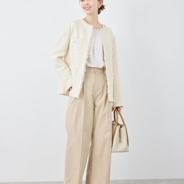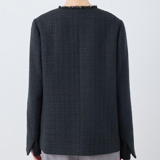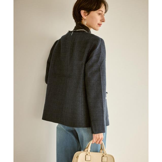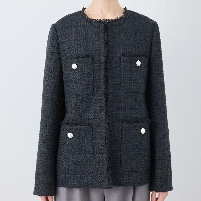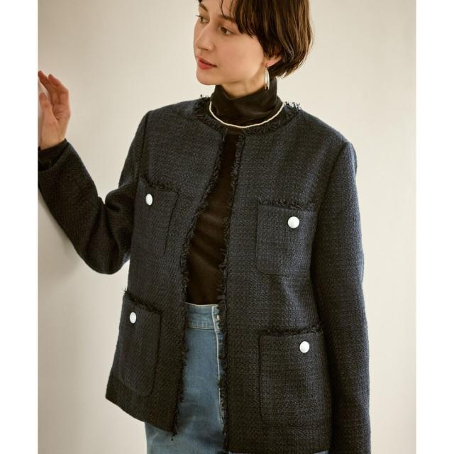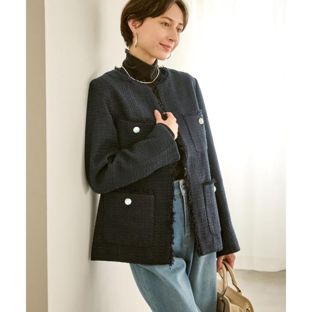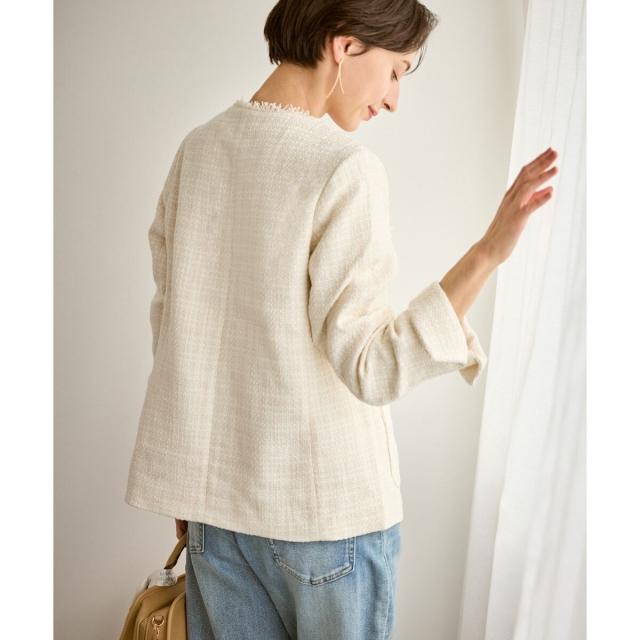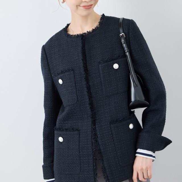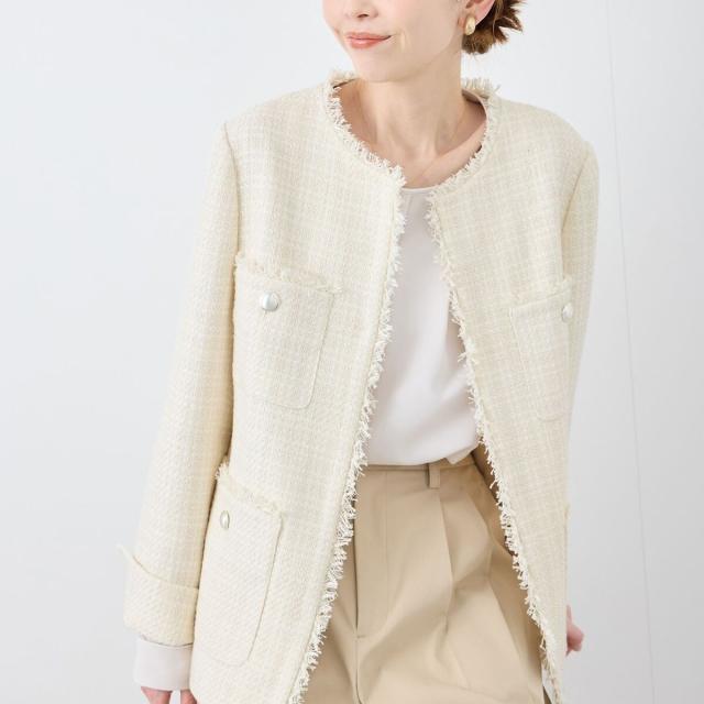 ・エターナルなノーカラーデザインが魅力のツイードジャケット。