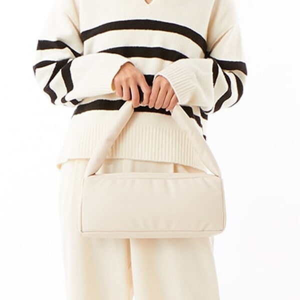光沢感のある素材と横長のフォルムがトレンド感のあるハンドバッグです。