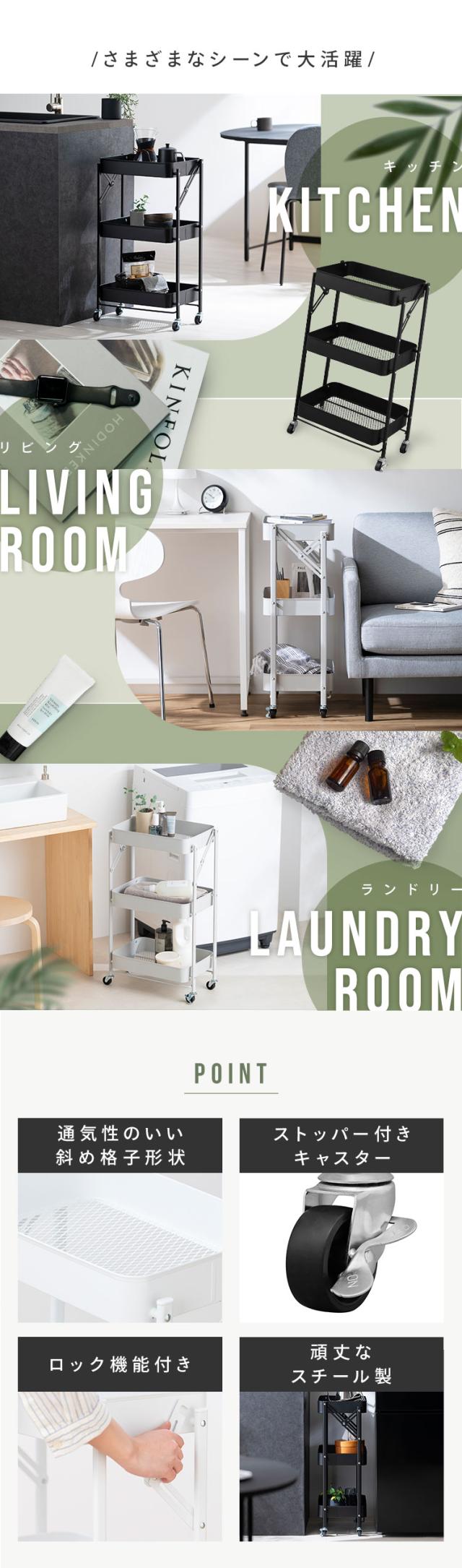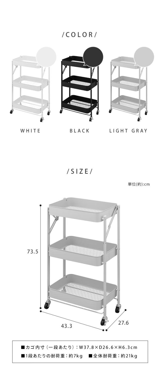(検索用:キッチンワゴン キャスター付き 3段 スリム 折りたたみ キャスター付き ワゴン ストッパー付き スチールワゴン 北欧 組立簡単 収納 4967576743358 4967576743365 4967576743372)