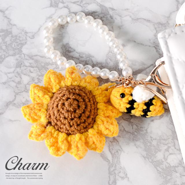 バッグチャーム レディース チャーム キーホルダー 毛糸 ニット かぎ針編み ひまわり【ひまわり&ハニービーニットチャーム】 cr-0028