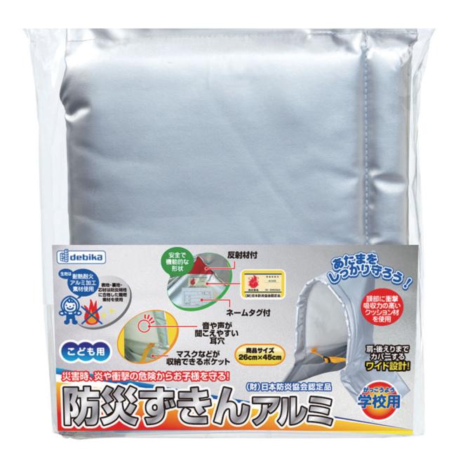災害時に役立つ防災頭巾です。耐熱耐火のアルミ加工素材を使用しています。クッション性もあり、災害時の落下物から頭部を守ることができます。ヘルメットに比べ軽量なので、小さいお子様〜大人まで使いやすい防災頭巾です。