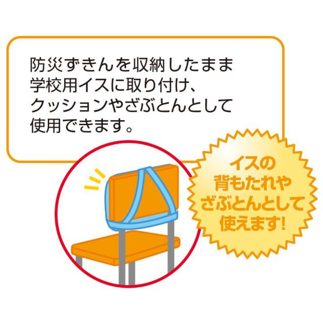 別売りの収納袋に入れると、防災頭巾を背もたれや座布団としてお使いいただけます。学校などの限られた収納場所しかない場合に便利なアイテムです。