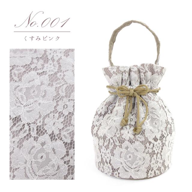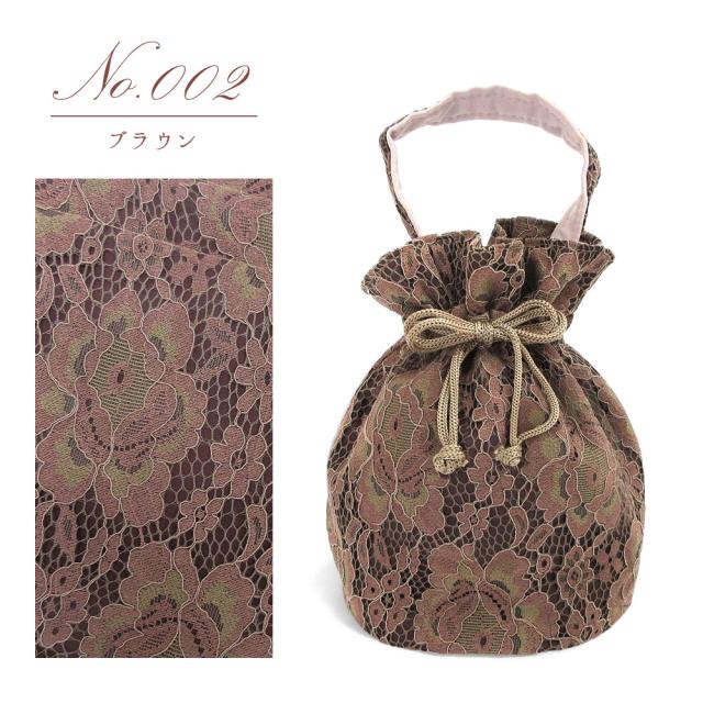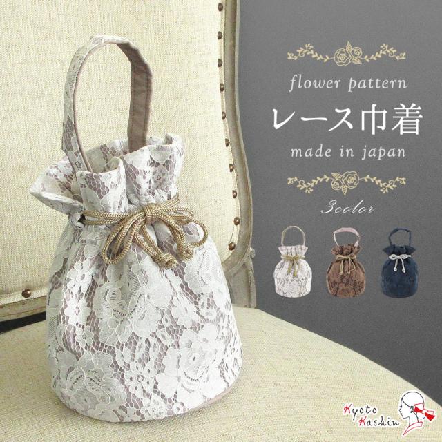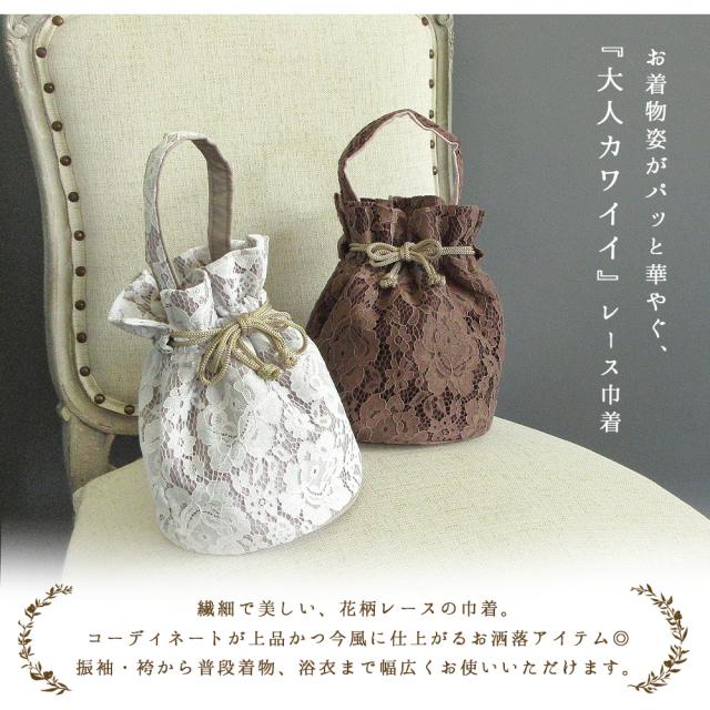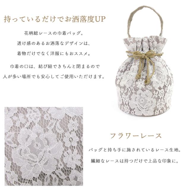 【1枚までメール便発送OK】レース巾着バッグ花柄ワンハンドル3色和装洋装着物和装小物おしゃれきんちゃくバッグマチあり浴衣袴入学式卒業式可愛いかわいいシンプルレトロモダンくすみカラーニュアンスカラーピンクブラウンネイビー紺