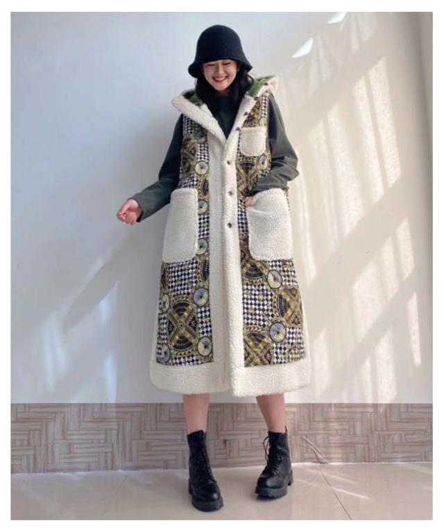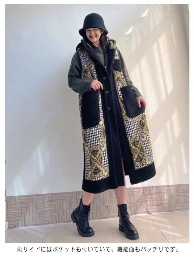 ボアジャケット ボア ロングジレ 切り替え リバーシブル ジレ 羽織り ジャケット 袖なし ロング 上着 アウター ノースリーブ ロングベスト 体型カバー 配色 柄 両面使える 前開き フード付き カジュアル 暖か ボア きれいめ 春 秋