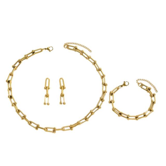 | ・ネックレス、ブレスレット、ピアス3点ジュエリーセット ・人気のUチェーンモチーフはトレンド感を一気に演出します。 ・どんなスタイルにも合わせやすく、装いのアクセントにも最適。 ・シンプルさとボリュームを両立させた洗練デザインが魅力 | |
