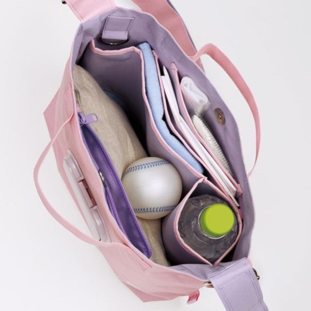 バッグの内側には、ペットボトルを立てて入れられるペットボトルホルダーと、Wポケットと仕切り付きで中身を整理しやすく、必要なものがサッと取り出せるようになっています。内側サイドにDカンが付いているので、カバンの中で迷子になりやすい鍵などを引っ掛けて取り付けておくことができます。バッグはマグネットホック仕様で、開け閉めも簡単です。