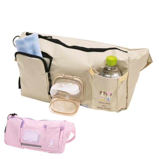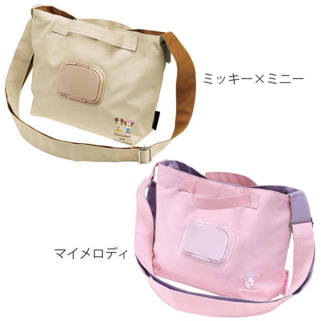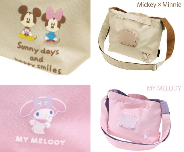 ベージュカラーのバッグにはミッキー×ミニー、ピンクカラーのバッグにはマイメロディのワンポイントデザインが付いています。かわいいキャラクターデザインのバッグでお散歩中の気分も上がります。