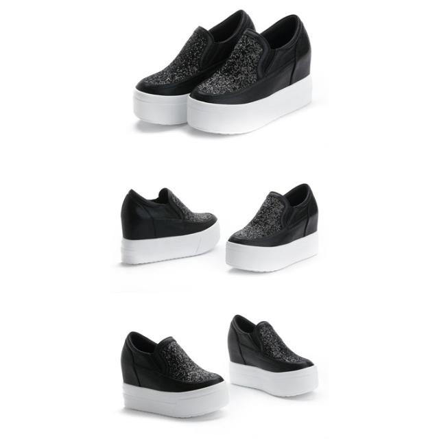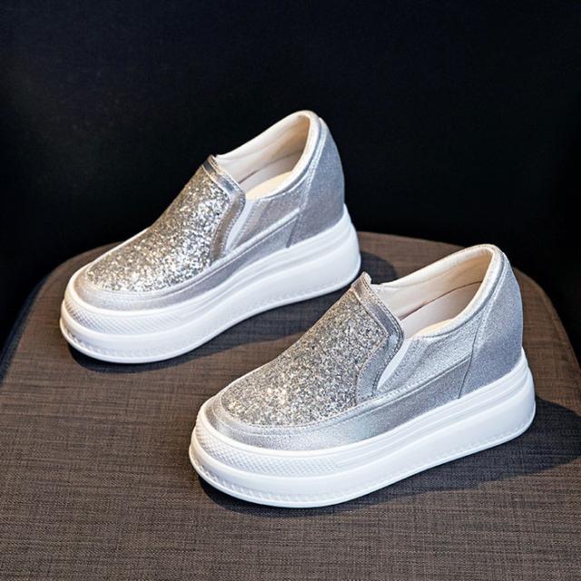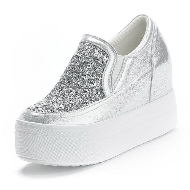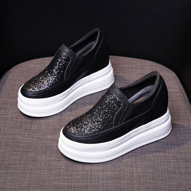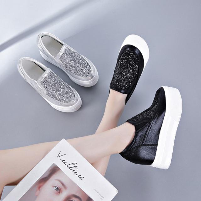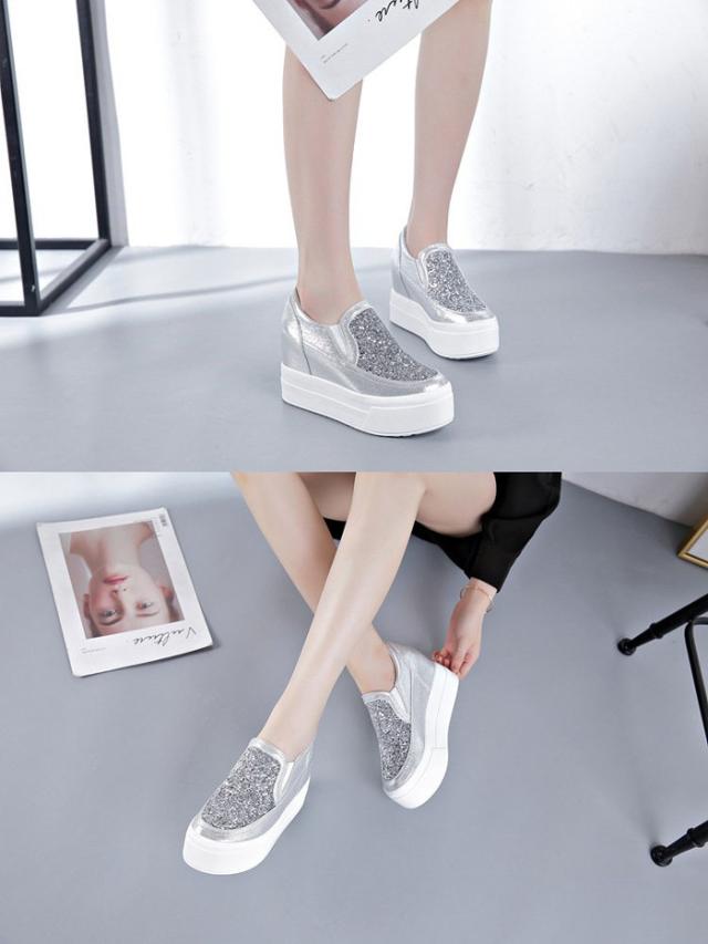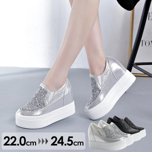 スニーカー インヒール キラキラ スリッポン ゴムソール PU 厚底 小さいサイズ 大きいサイズ ローカット ローファー レディース ブラック シルバー di177x0x0h5