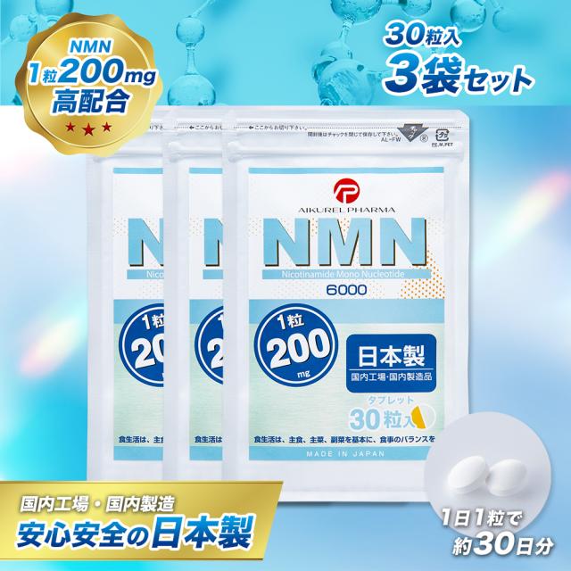 【レビュー投稿で+10%ポイント還元】30粒入 3袋セット NMN タブレット サプリメント 6,000mg (1粒に200mg) 日本製 β-ニコチンアミドモノヌクレオチド 高純度99.9% GMP認定工場 二酸化チタン(着色料)不使用 アイクレルファーマ